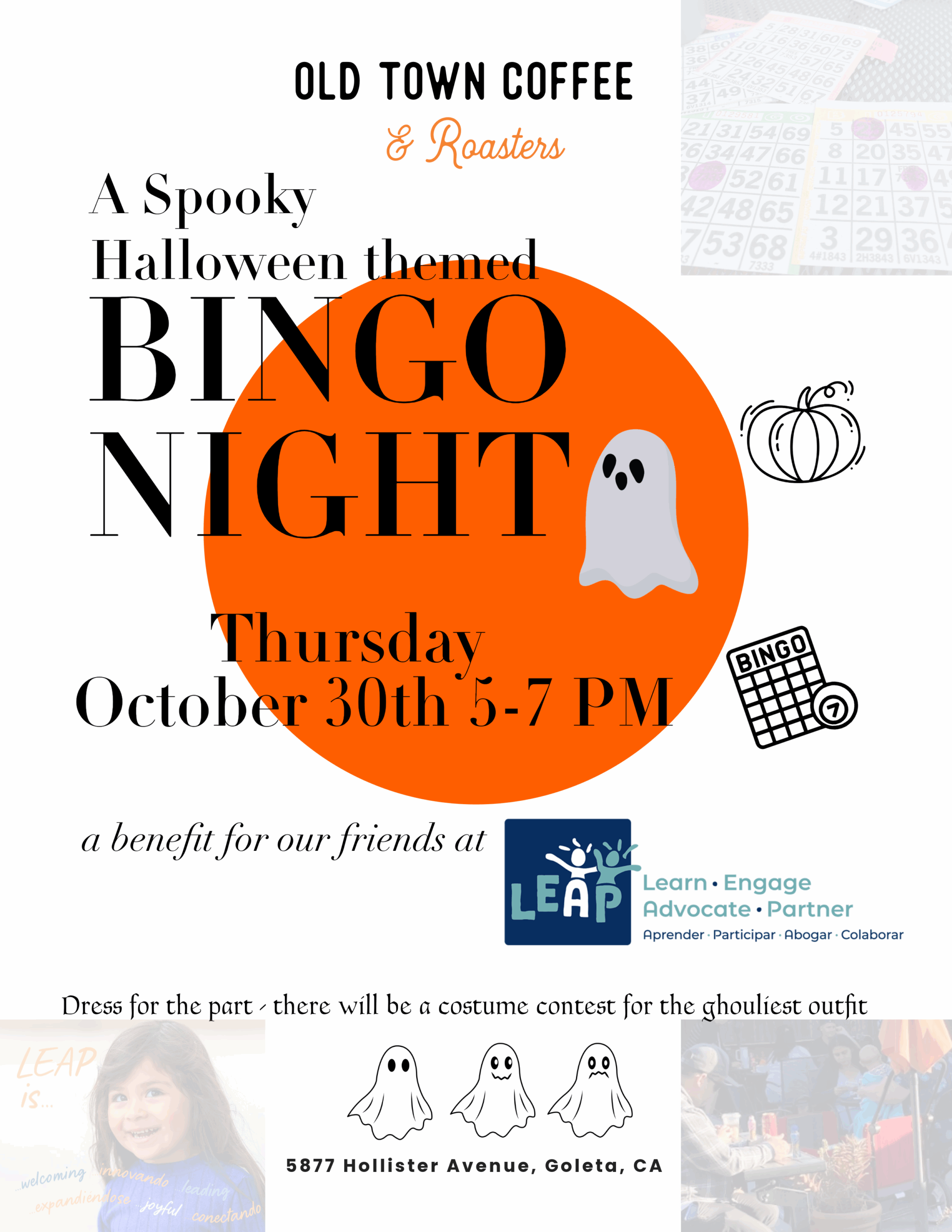 Join us at Old Town Coffee in Goleta on October 30th for Bingo Night! Bring your friends and family for a fun-filled night, all for a great cause: supporting local children and families through LEAP. Join us on October 30 from 5–7 PM at Old Town Coffee in Goleta, and come ready for the Halloween costume contest!