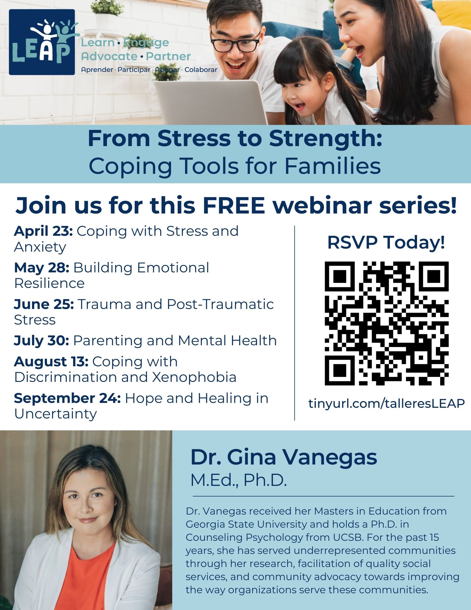 Join us for the first session of LEAP’s new six-part workshop series, From Stress to Strength: Coping Tools for Families. This session, Coping with Stress and Anxiety, will cover managing stress, understanding anxiety, and self-regulation techniques.