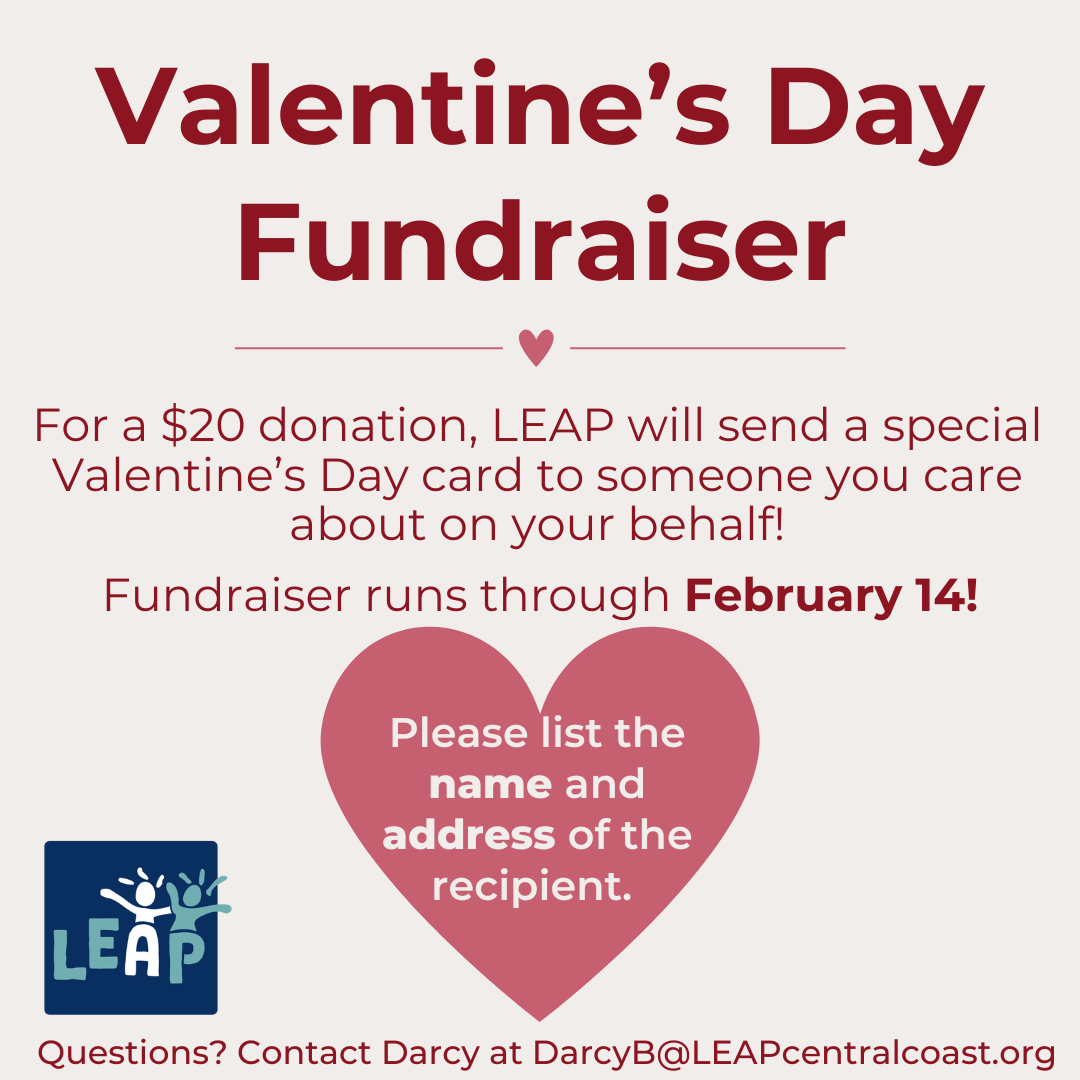 For a $20 donation, LEAP will send a special Valentine’s Day card to a loved one on your behalf. Each heartfelt card helps provide essential support to children and families across the Central Coast.